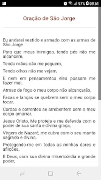앱을 열면 Saint George의 명언이 따르고 일일 기도문이 표시됩니다. 기도문은 포르투갈어로 표시되며 읽기 쉽습니다. 사용자는 기도문의 오디오 녹음을 듣기를 원한다면 들을 수도 있습니다.
